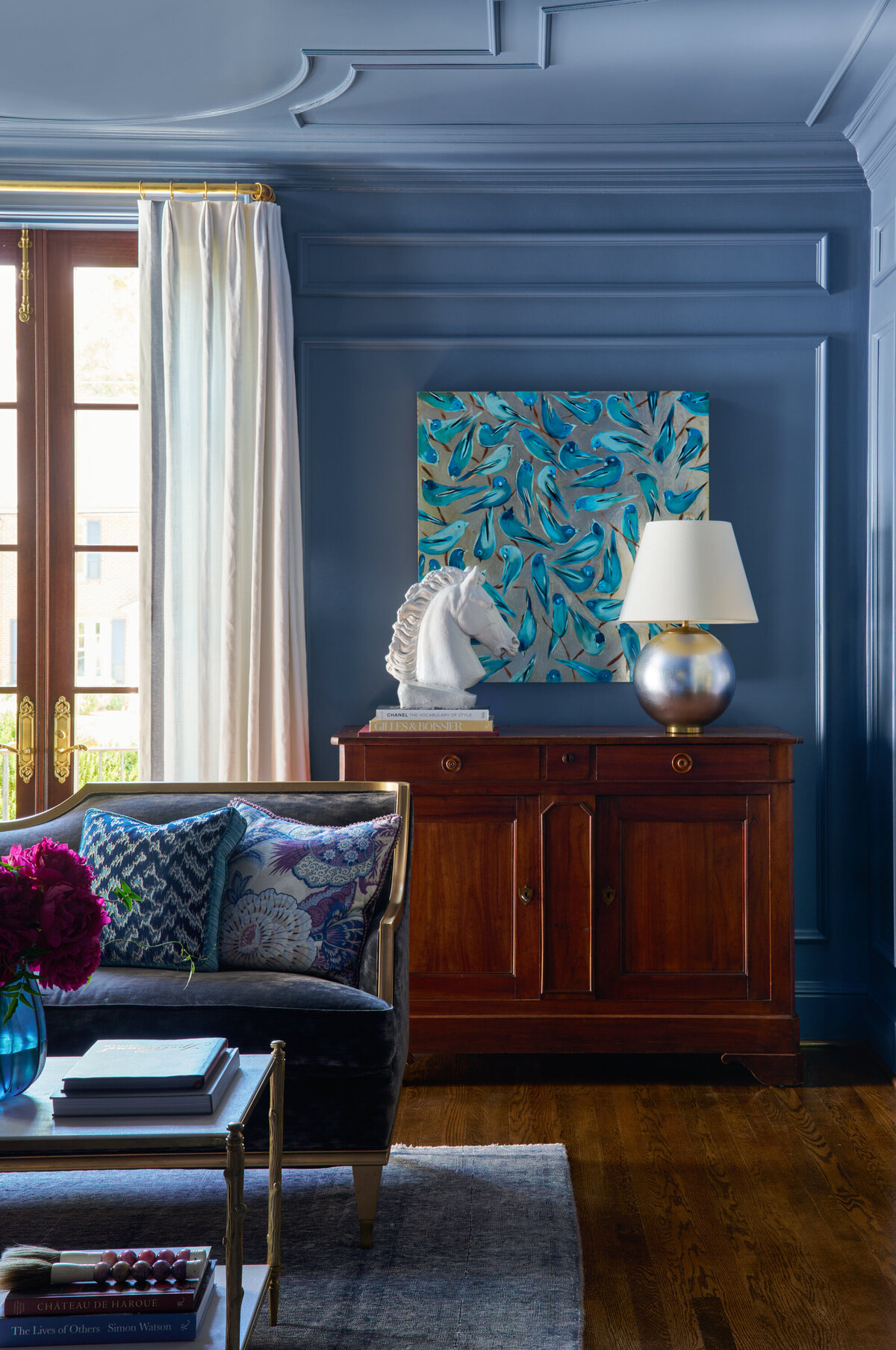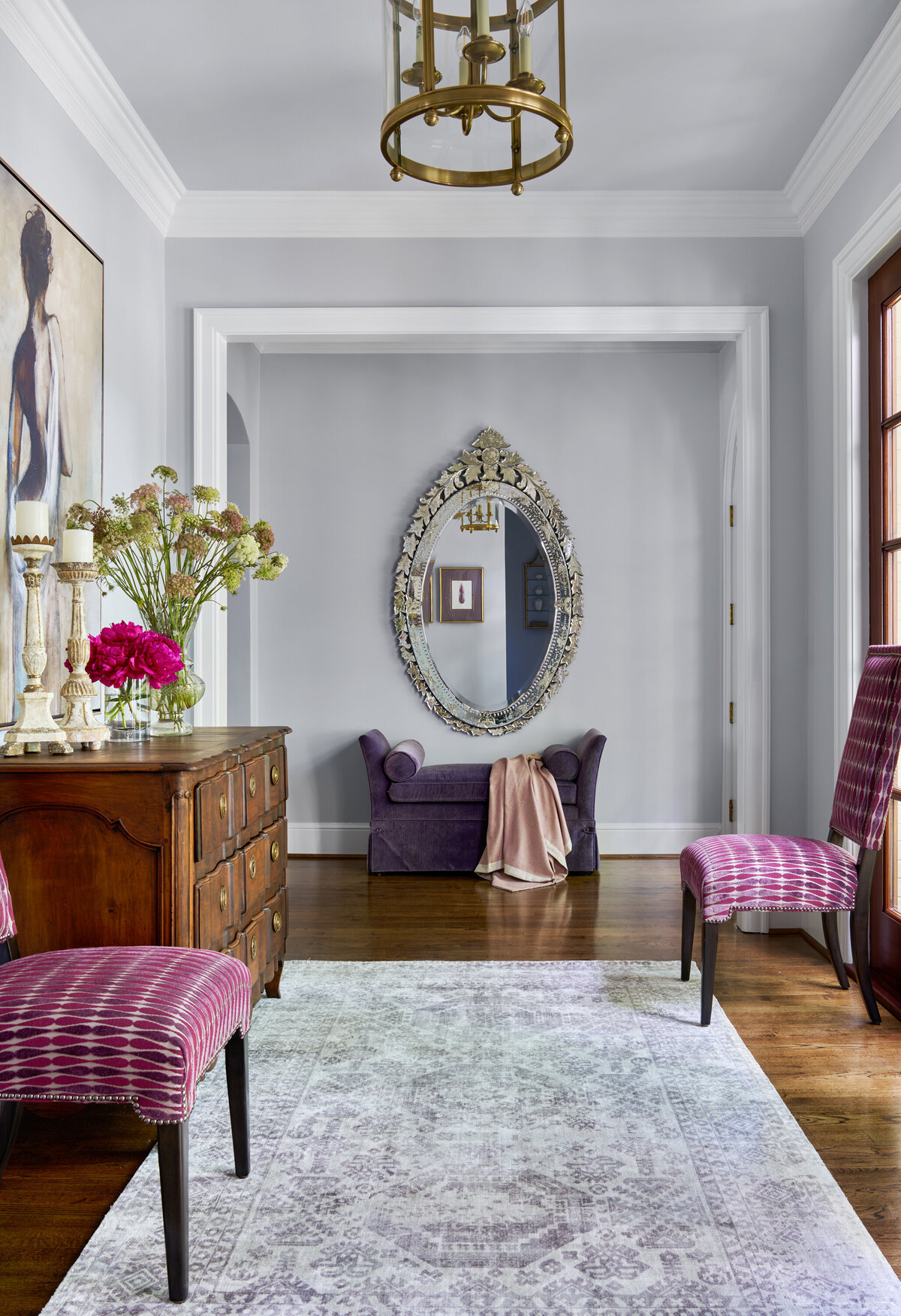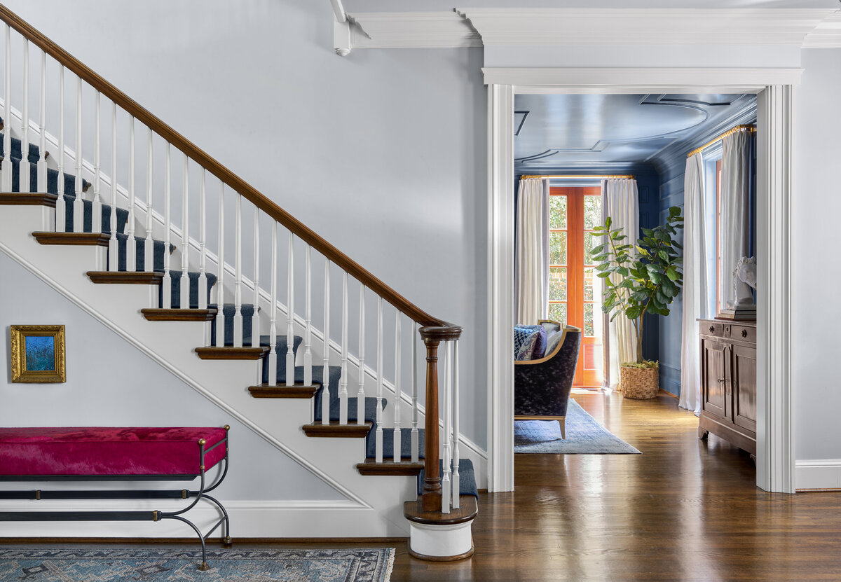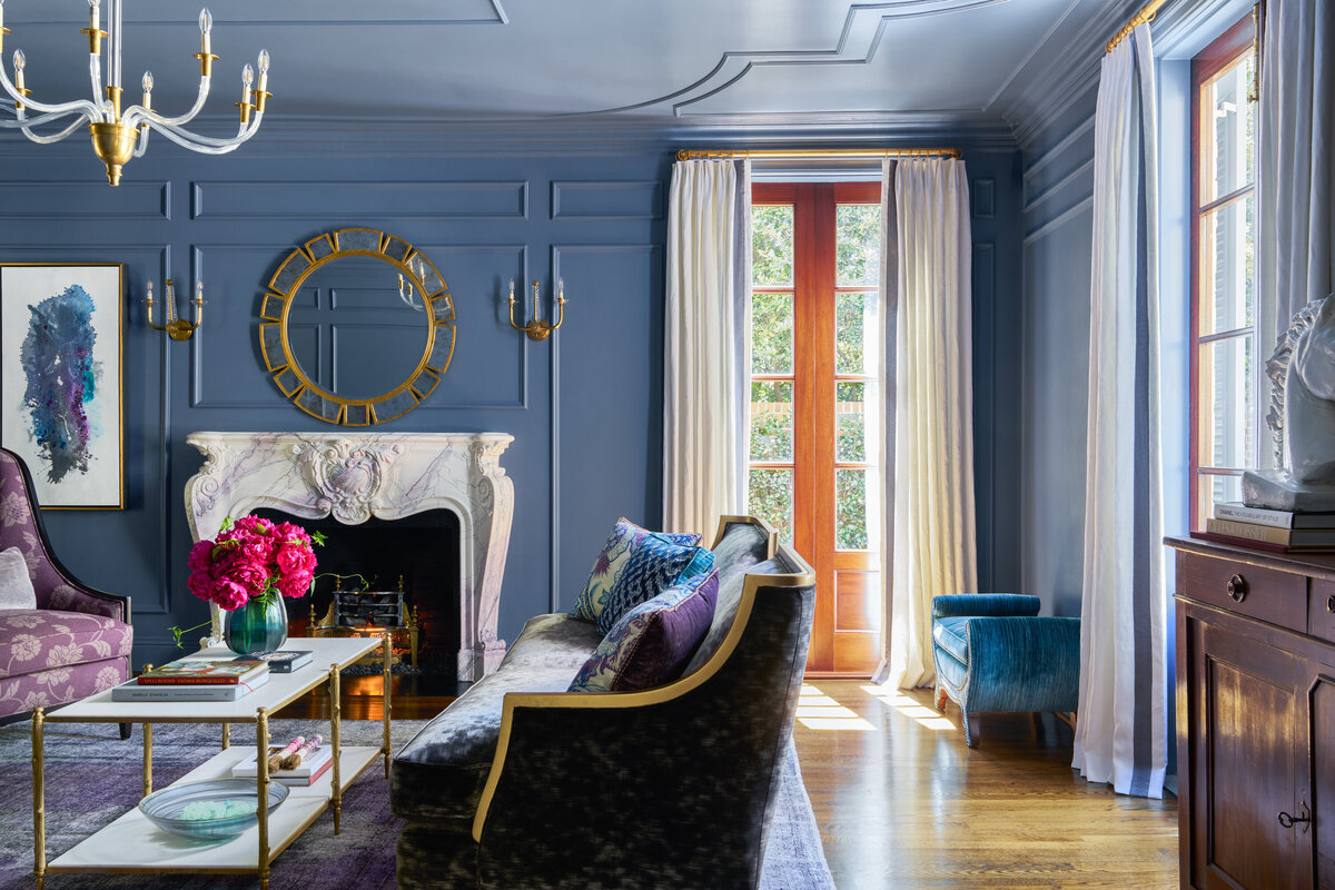 Situated on one of the most beautiful streets in Greenville, South Carolina, this c.1930 residence, originally designed by architect William Ward, offered the perfect canvas for a fresh take on traditional design. Guided by the home’s classic exterior with French influences, the interiors embrace an elegant yet livable style, dressed in a palette of regal blues and purples accented with silver and gold. Designed for a young family, the spaces balance sophistication with functionality, creating rooms that are equally suited for everyday living and gracious entertaining. The result is a timeless home that feels both refined and inviting, honoring its historic character while supporting modern life.
